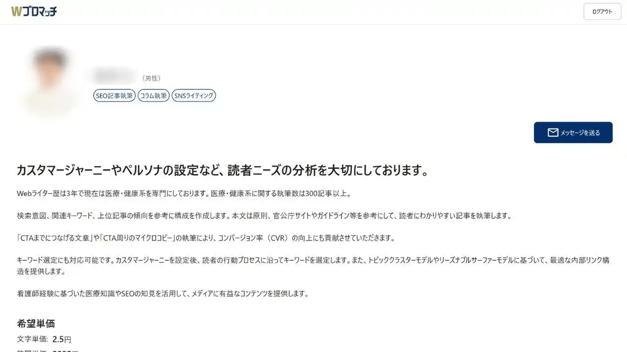 各ライターのプロフィール画面(「メッセージを送る」ボタンからスカウト連絡可能) |