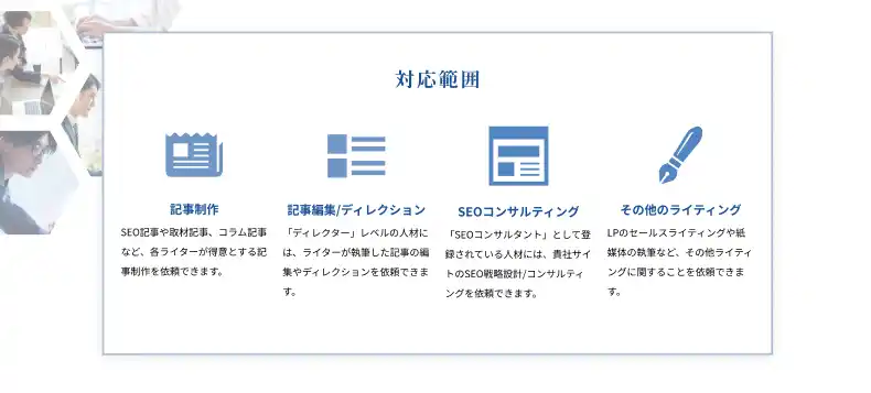 SEO記事から取材、LPライティングまで幅広く対応可能 |