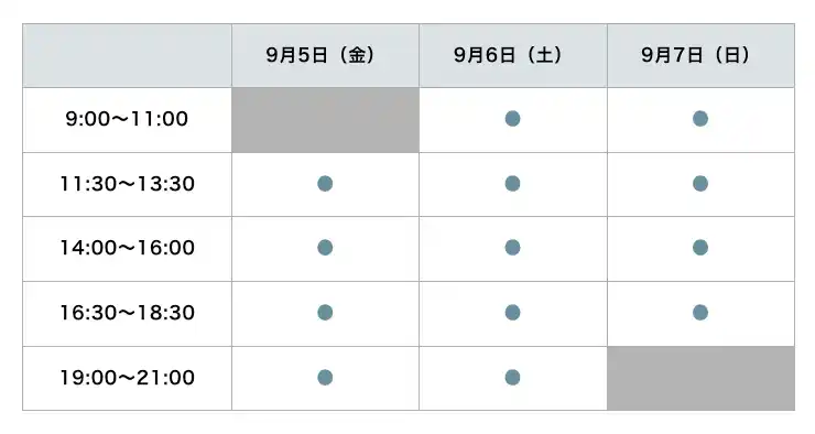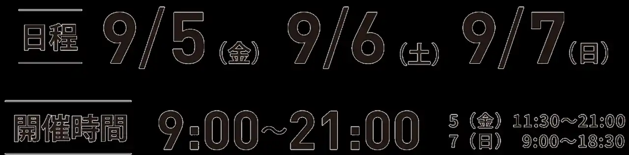 2025年 9月5日(金)11:30~21:00 9月6日(土)9:00~21:00 9月7日(日)9:00~18:30 |