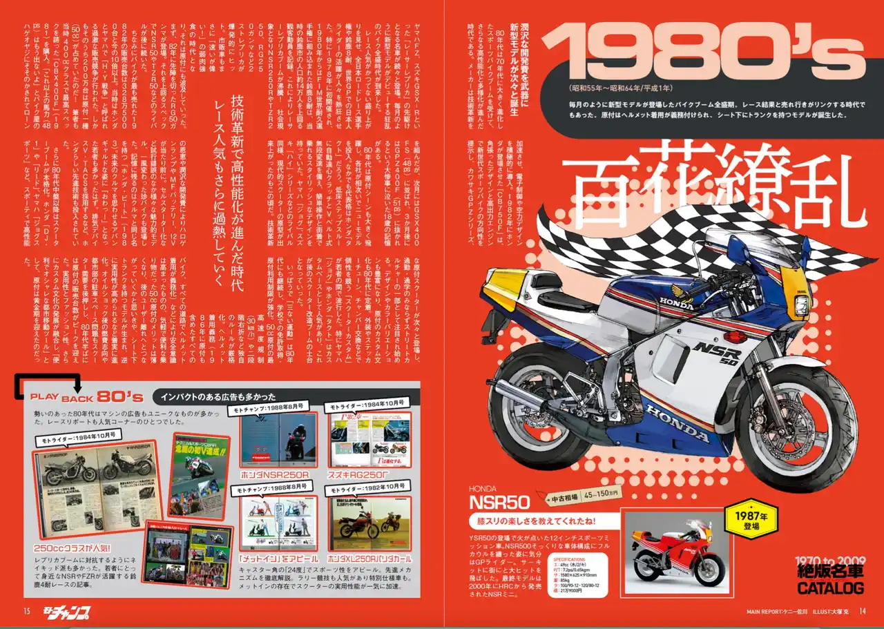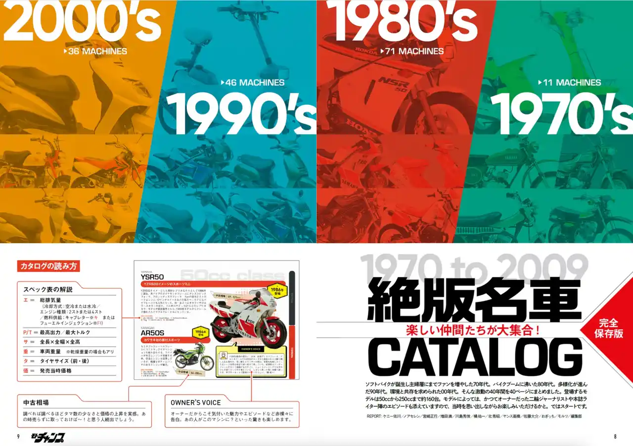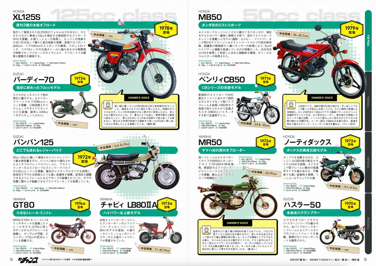 ソフトバイクが誕生し主婦層にまでファンを増やした70年代。バイクブームに沸いた80年代。多様化が進んだ90年代。環境と共存を求められた2000年代。そんな激動の40年間を40ページでお届け! 登場するモデルは50cc~250ccまで約160台。モデルによっては、かつてオーナーだった二輪ジャーナリストや本誌ライター陣のエピソードも添えていますので、当時を思い出しながらお楽しみください。