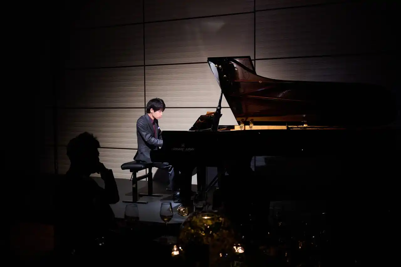 この饗宴をさらに特別なものにしたのは、「婦人画報&美しいキモノプレミアム」の連載が好評の人気ピアニスト・務川慧悟さん。小林シェフとその志に共鳴するシェフ、パティシエによる料理の余韻を深める曲を、務川さんが自ら選び、全3曲が披露されました。務川さんが奏でる流麗なピアノのメロディが、コース料理の合い間のひとときを華やかに彩りました。 |