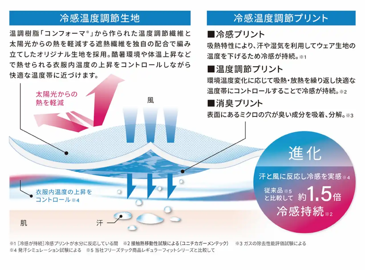 ※3 衣服内温度の上昇をコントロールし、快適な温度帯に近づけることにより得られると考えられるものです(ユニチカガーメンテック) |