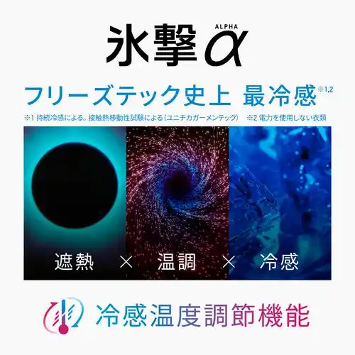 酷暑環境や体温上昇などで熱せられる衣服内温度を快適域に近づける効果により、 “氷撃”冷感プリントの冷感効果を実感アップさせた商品。また、冷感効果はもちろん、衣服内は爽快性※3をキープ。酷暑の中、屋外で長時間作業される方やスポーツされる方に適した冷感ウエア。 |