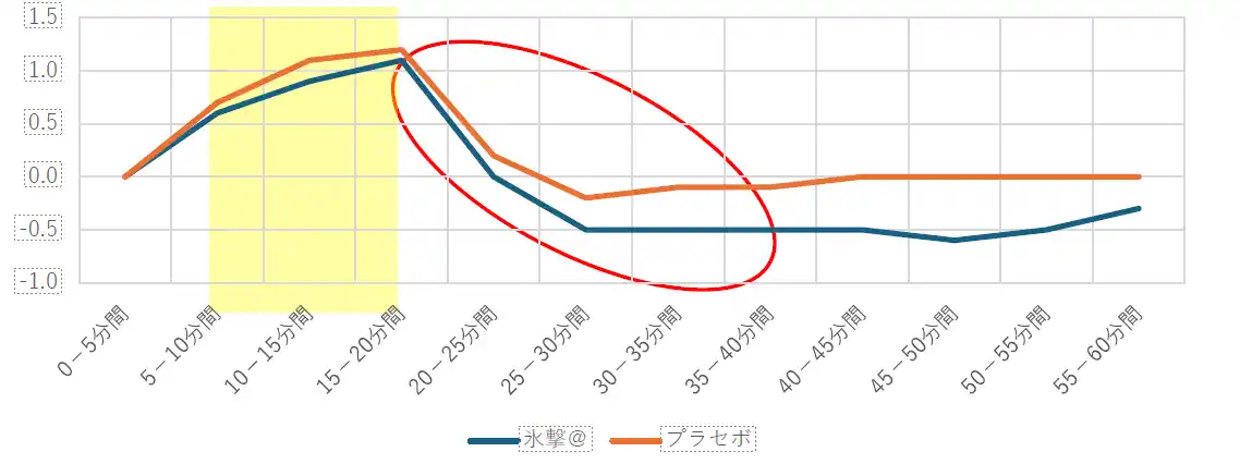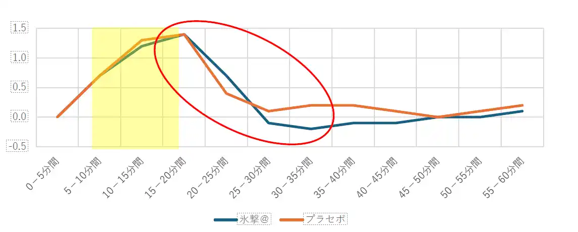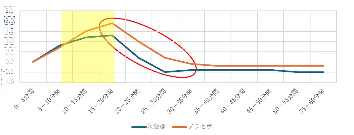 「氷撃α」の試験時の初期体温が高かったため、体温経過自体は高く表示されているが、運動終了直後にその差異がなくなるところまで体温は低下している。また運動中の体温上昇もプラセボと比較し抑えられており、また初期体温より低い状態が60分に渡り維持されている 。 |