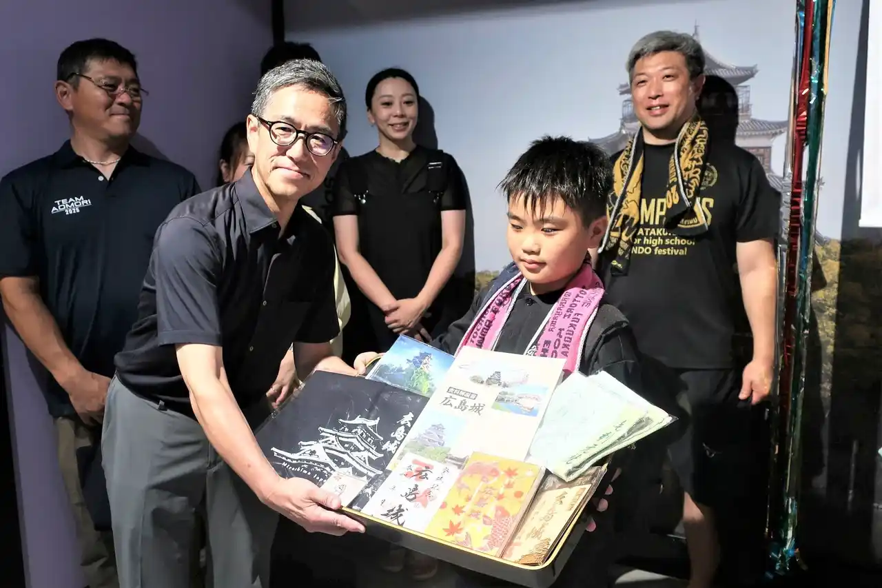 神尾副館長から広島城図録や限定グッズなど記念品贈呈 |