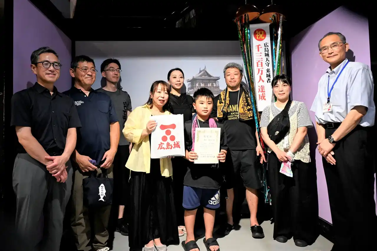 広島城(館長:公益財団法人 広島市文化財団 大村昭彦/副館長:指定管理者 広島城アソシエイツ事務局長 神尾正博)では、昭和33年(1958)6月1日に開館した現在の天守の累計来城者数が1,300万人に達したことを祝して記念セレモニーを行いました。 |