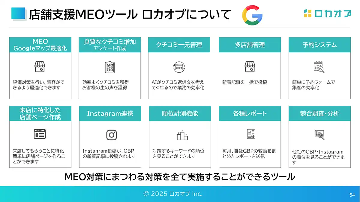 本セミナーでは、Googleマップ対策やクチコミ管理、予約導線の最適化など、来店型ビジネスを一括支援するMEOツール「ロカオプ」も紹介されました。Instagram投稿との連携や競合比較、クチコミ返信のAI支援機能などを備え、効率的な運用と成果の両立を実現できるサービスです。 |