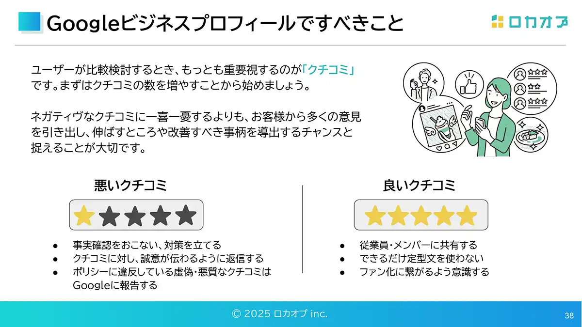 Googleビジネスプロフィールにおけるクチコミは、単なる評価指標ではなく「比較される中で選ばれる」ための重要な判断材料です。セミナーでは、ネガティブな声も改善機会と捉え、定型文を避けた誠意ある返信や、スタッフ間での共有、継続的な声の回収など、運用面での工夫が成果に繋がることが強調されました。 |