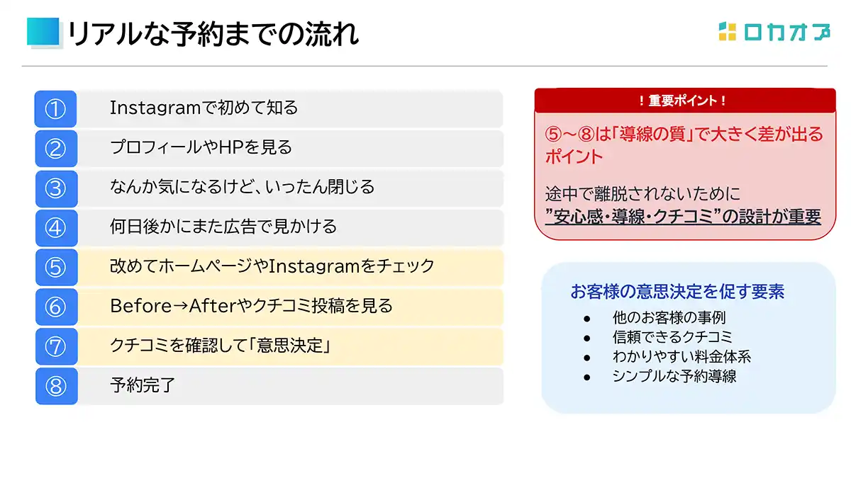 セミナーでは、Instagramの本来の役割を「今すぐ来店につながる認知チャネル」ではなく、「印象を残し、思い出してもらうための記憶チャネル」として活用すべきだという視点が紹介されました。多くのユーザーは、すぐに予約や来店には至らず、一度「見たことがある」「気になっていた」状態を経て、別のタイミングで検索・来店という行動に移る傾向があります。 |