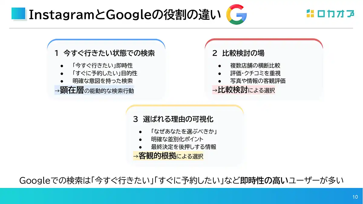 一方で、Google検索やGoogleマップは「今すぐ行きたい」「すぐ予約したい」という明確な意図を持つ顕在層が利用するチャネルです。ここでは「比較検討」「信頼性」「差別化」などの視点で、選ばれる理由が可視化されているかが問われます。 |