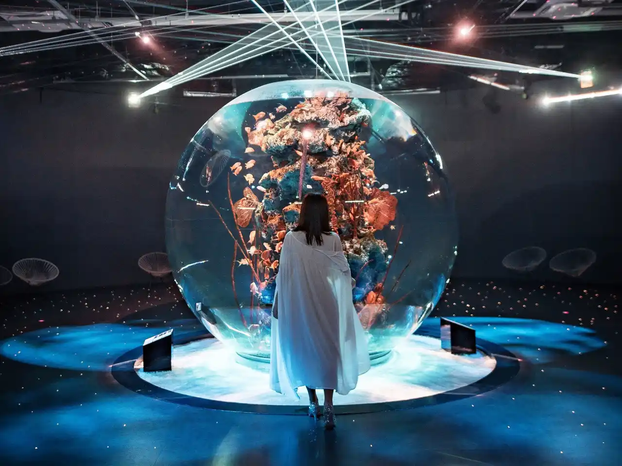 アトア3階にあるPLANETSの中心には、薄暗がりの空間の中に色鮮やかな魚たちが優雅に泳ぐ直径3mの球体水槽“AQUA TERRA”だけが鎮座する。生命が存在した「奇跡の惑星」を表現したこの世界は宇宙や深海の神秘性を彷彿とさせる。アトアにおいて一番のフォトジェニック空間。通常展示では、光のベールが降り注ぐようなレーザーパフォーマンス「AQUA UNIVERSE」が上演されている。 |