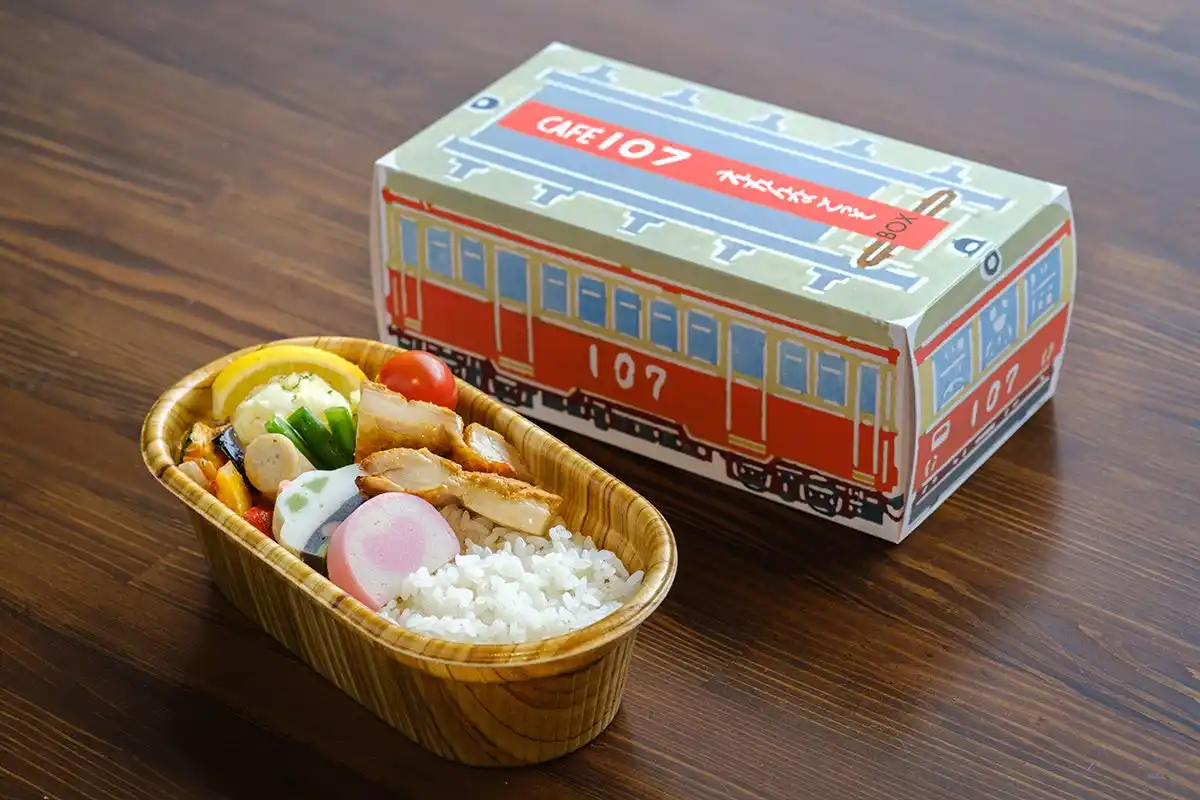 かまぼこの里のバイキングレストラン「えれんなごっそ」のメニューから好きなおかずを選んで、オリジナルのお弁当を作ります。箱根登山電車107 号オリジナルデザインのお弁当箱でお持ち帰りいただけます。 |