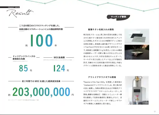 インパクトサークル株式会社(本社:東京都港区、代表取締役社長/CEO:高橋智志、以下「インパクトサークル」)は、JR東日本スタートアップ株式会社(本社:東京都港区、代表取締役社長:柴田裕、以下「JR東日本スタートアップ」)およびその出資先である株式会社ドッツアンドラインズ(本社:新潟県三条市、代表取締役:齋藤和也、以下「ドッツ」)と連携し、地域共創事業における社会的価値創出の実態を記録・可視化した「インパクトブック」を制作しました。 |