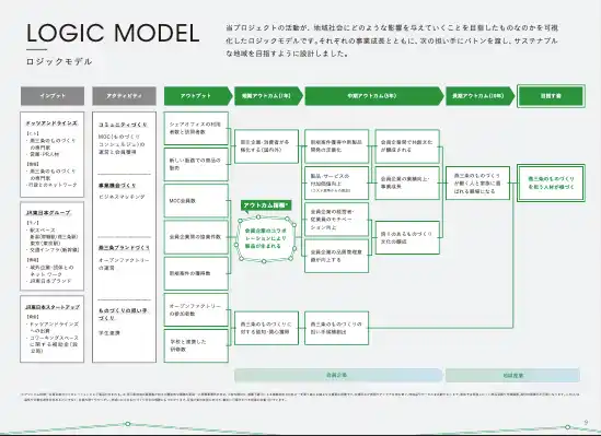 燕三条地域における中小製造業の連携や担い手不足といった課題を抽出し、「JRE Local Hub 燕三条」を拠点に、ドッツおよびJR東日本グループが推進するMOC(ものづくりコンシェルジュ)による地域会員企業間の連携や、首都圏などの他地域企業とのマッチングの取り組みを通じて事業が目指す姿を明確化し、ロジックモデルとして表現しました。 |