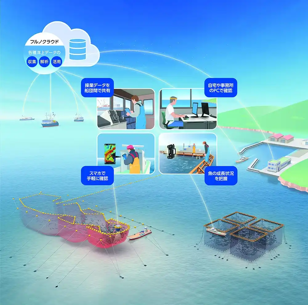 | 「漁視(TM)ダイアリー」は漁船に搭載している航海・漁労計器の情報をクラウドに収集し、離れた場所でも操業状況や海域状況などを記録・モニタリングできるデータ収集システムです。魚探やソナー映像はもちろん、潮流や水温、船の位置情報などの操業データを僚船間で共有することができます。漁具投入や最適な漁場を判断する際に僚船内で同じ情報を確認することで高効率な操業に繋がります。 | ||||||||||||||