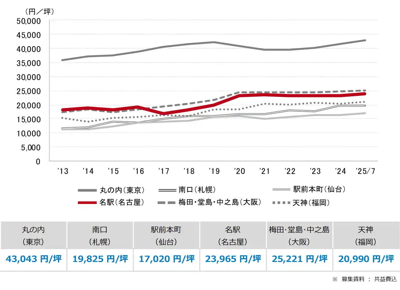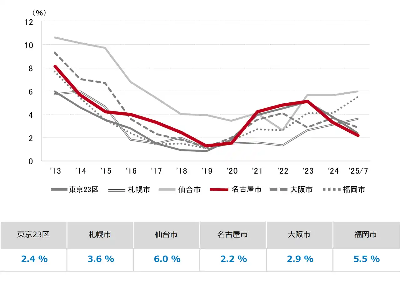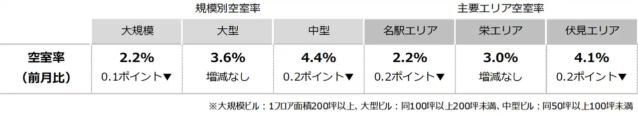 三幸エステート株式会社(本社:東京都中央区、取締役社長:福島正二郎)は、2025年7月度の名古屋市オフィス賃貸状況(空室率&現空面積:全規模、募集賃料&募集面積:全規模、規模別空室率、主要エリア※1空室率:全規模)および全国6大都市(東京・札幌・仙台・名古屋・大阪・福岡)の大規模ビルのマーケットデータをまとめた「オフィスマーケット2025年8月号名古屋」を公表します。 |