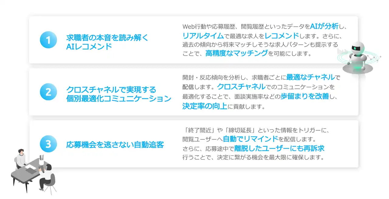 AIの活用によって求職者の本音を理解した上でアプローチできるため、内定辞退や早期離職の減少、採用決定率の向上、そして長期的な採用コストの最適化を実現します。また、求職者ごとに最適な求人提案やアプローチ方法が明確になることで、業務の属人化を防ぎ、採用担当者の負担軽減にも貢献します。 |