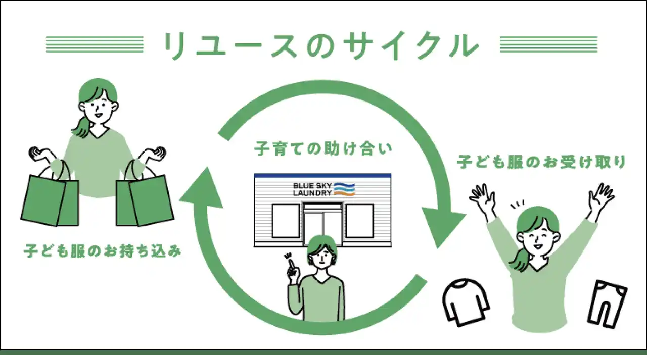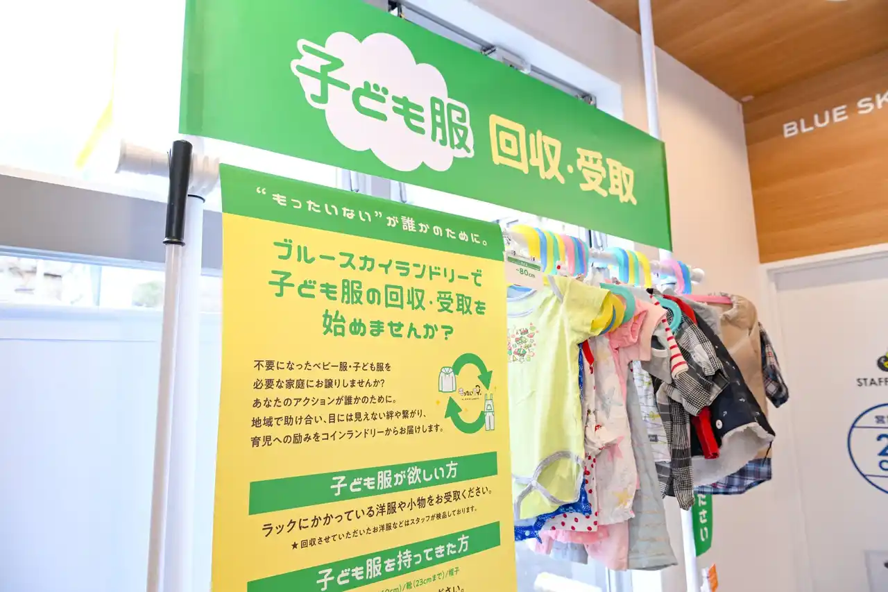 こうした時代の流れの中、フリマアプリなどによる個人間取引(CtoC)も一般化していますが、ブルースカイランドリーの「子ども服リユースブース」は、地域の中で気軽に衣類を循環させる“コミュニティの場”として生まれた新たな取り組みです。 |