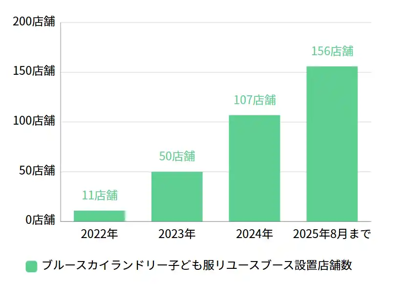 株式会社ジーアイビー(本社:名古屋市中区、代表取締役:鈴木 衛)が運営するコインランドリー「ブルースカイランドリー」では、2025年8月現在、全国156店舗で子ども服リユースブースを展開しています。 |