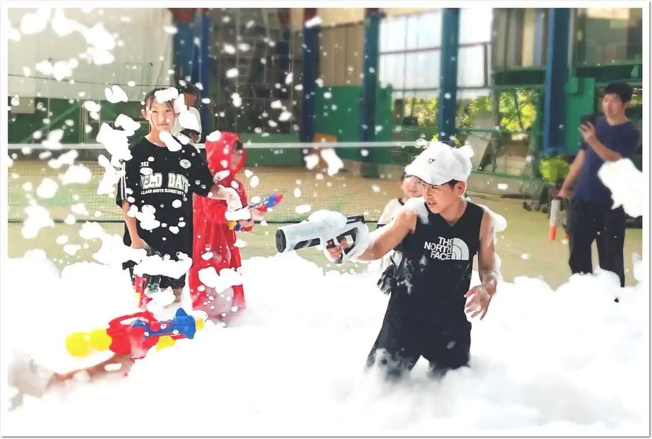 テニスコート全体をふわふわの泡でいっぱいにして、子どもたちとコーチが思い切り遊ぶ夏恒例のイベント「あわあわパーティ」を開催しました。 泡の中を駆け回ったり、水鉄砲で撃ち合ったりと、コートは笑い声と歓声に包まれ、大人も子どもも全身びしょぬれになりながら夢中で楽しみました。 |