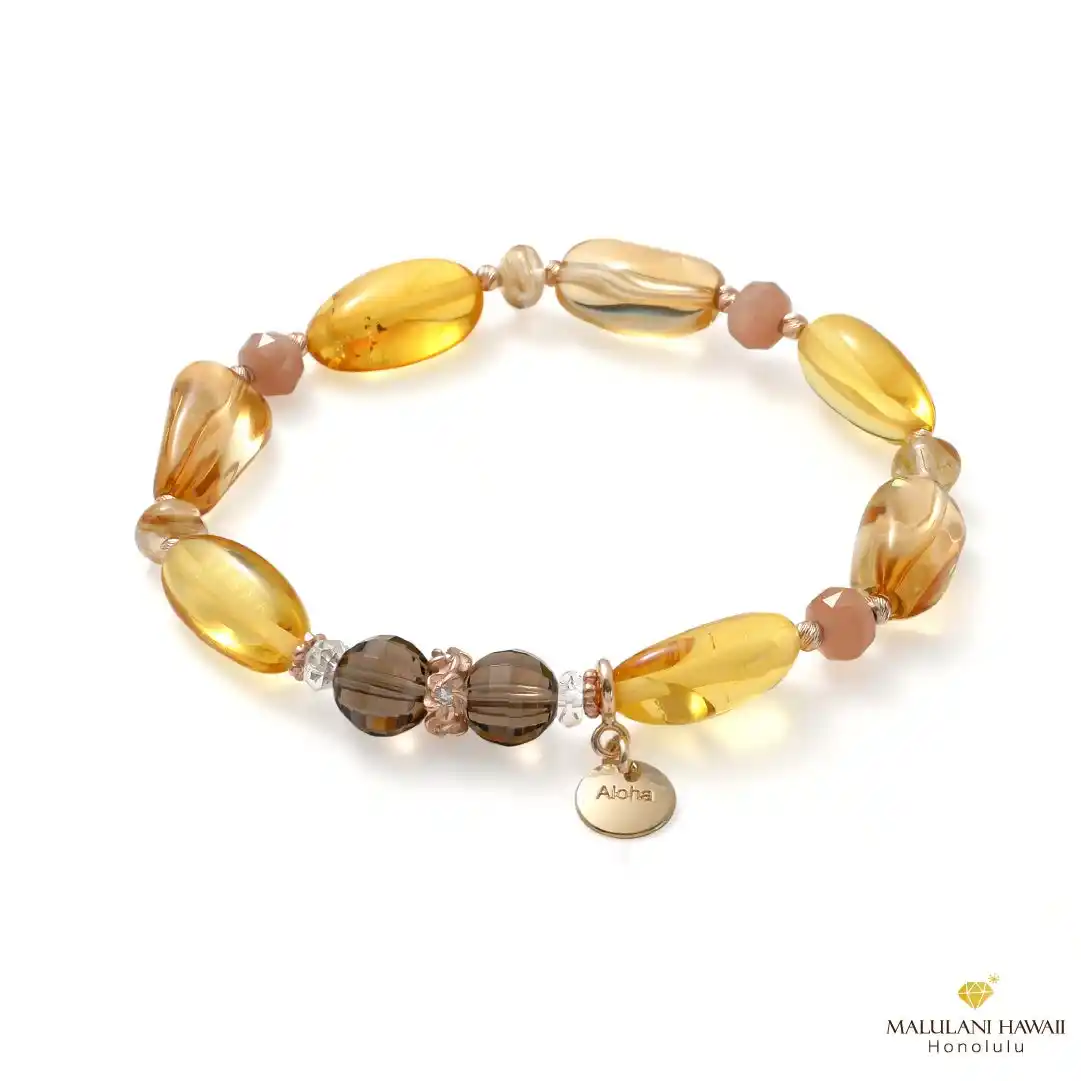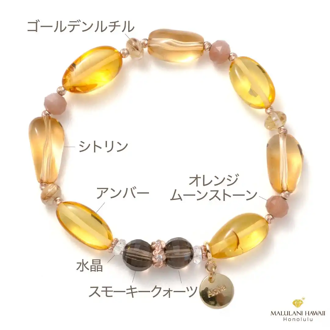 | 太陽のような輝きを秘めた天然石と、ハワイを象徴するプルメリアモチーフのハワイアンジュエリーを組み合わせた、心と人生にあたたかい光を届けるプレミアムなブレスレットは、人生に光をもたらすお守りにぴったり。 | ||||||||||||||||||