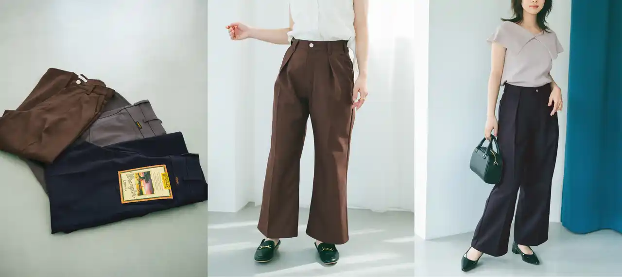 高めの腰位置でウエストにフィットしながらヒップラインを拾わず、センタープレスによる脚長効果など、細部まで計算された一本です。 |