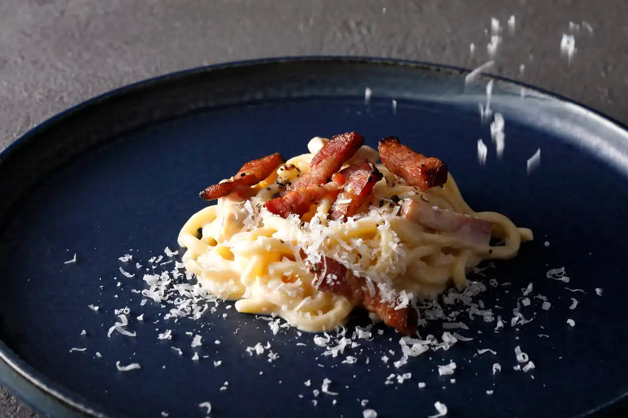トマトのグラニテを添えて』は、ツブ貝の旨味とキャビアの塩味が少し太めのパスタにしっかりと馴染み、真夏の塩分チャージもさっぱり美味しく叶います。仕上げの透明感あるトマトのグラニテを口に含んだ瞬間広がるひんやり食感で清涼感をプラスする、涼しげな逸品です。「ベッラ・ヴィスタ」の真骨頂である炭と薪を使用したグリル料理を味わいたいときには『薪炙りベーコンのカルボナーラ』がおすすめ。芳醇な香りを纏ったブランド豚「トウキョウX」のジューシーなベーコンとクリーミーなソースがパスタと絡み合う、食べ応え抜群の一皿です。 |