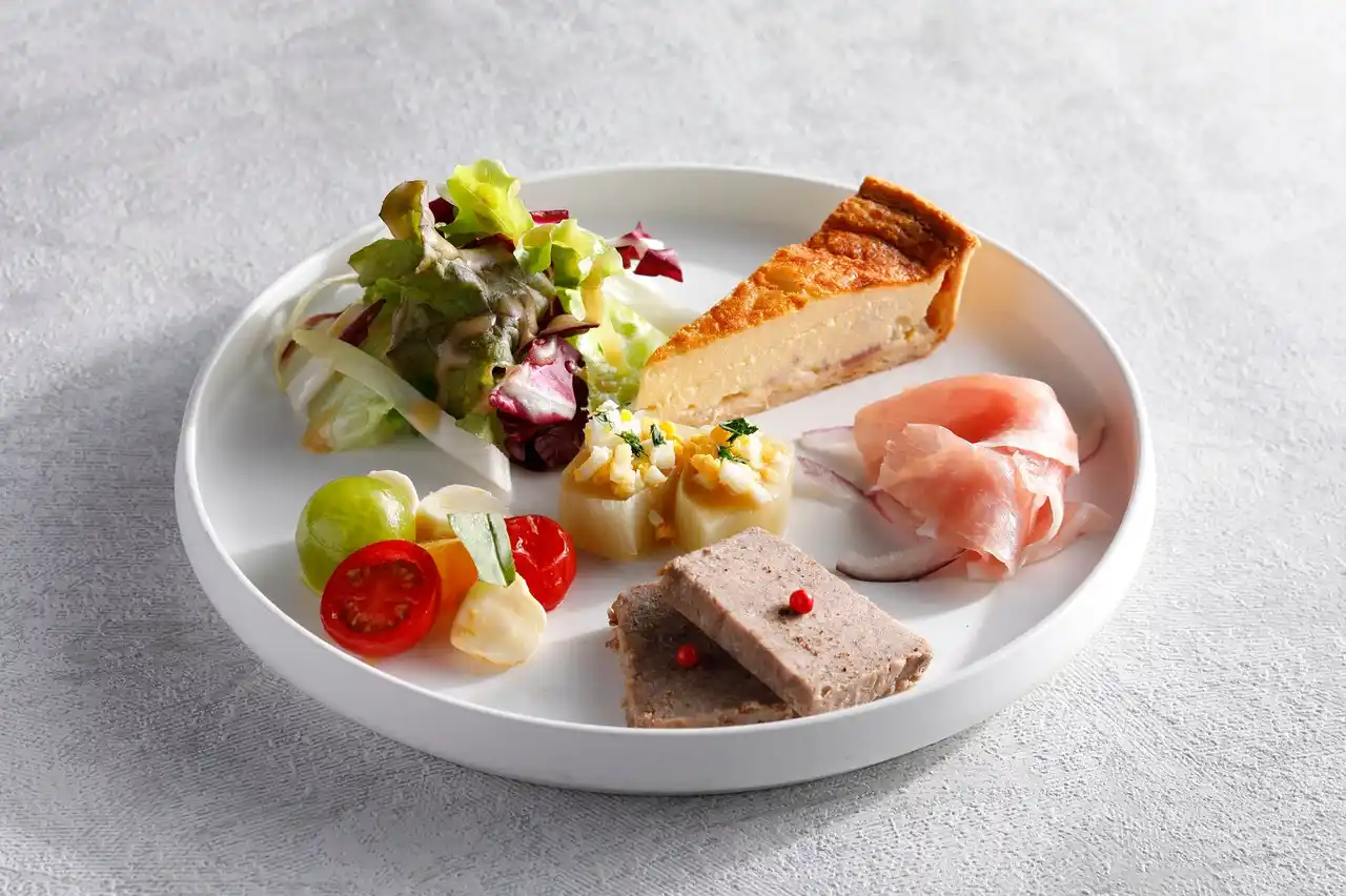 豚肉を香味野菜などでじっくり煮込み、ペースト状にした『リエット』や、色鮮やかなサラダをはじめ、フランス料理やイタリア料理からインスピレーションを受けた10種類以上の前菜が並ぶ「前菜バー」がランチタイム限定で登場。コースのスタートは、色とりどりなメニューの中からお好きなものをお選びいただけます。 |