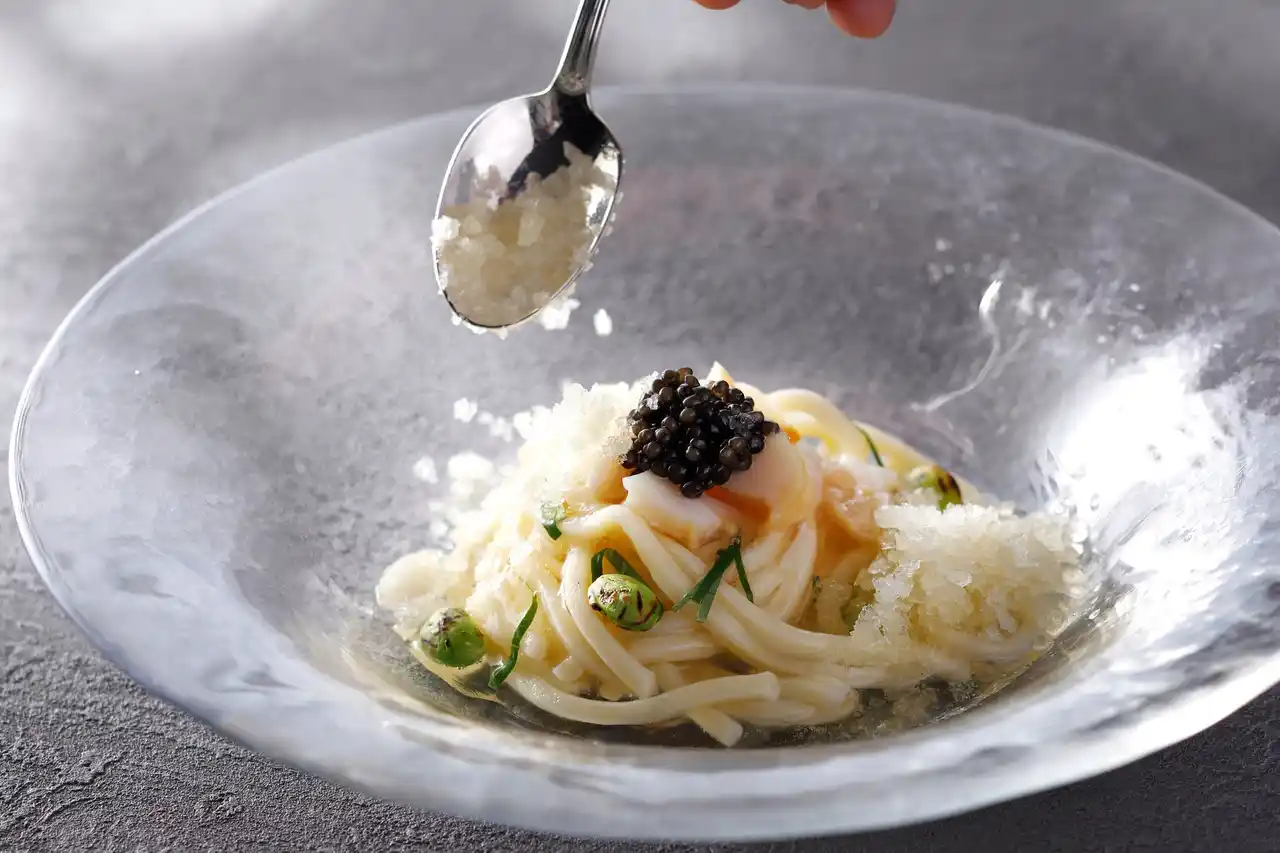 メインに登場するパスタは5種類から選択が可能。『桃と生ハムの冷製パスタ 山椒のアクセント』は、旬の桃を贅沢に使用し、山椒の爽やかさがピリリと心地よい刺激を添える冷製パスタ。目にも涼やかな『ツブ貝とキャビアの冷製パスタ