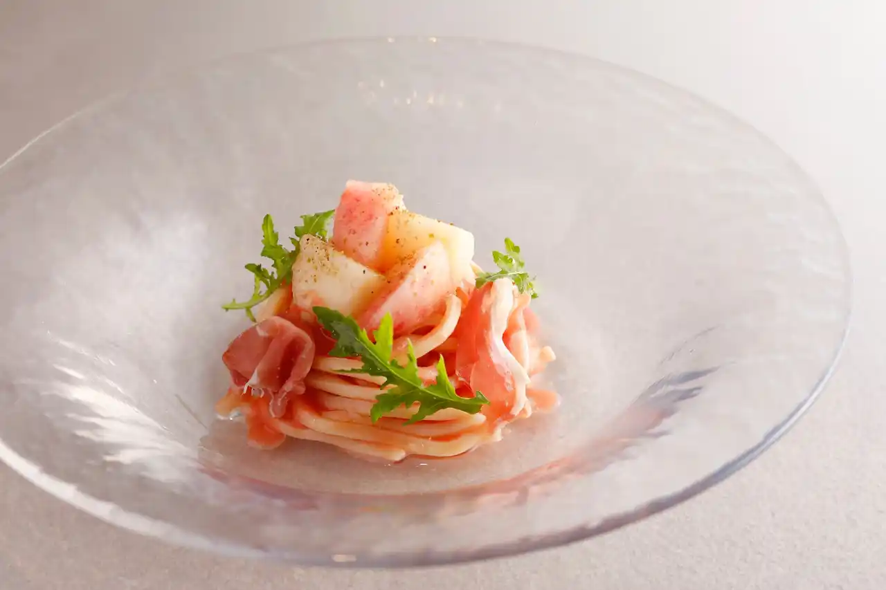 『桃と生ハムの冷製パスタ 山椒のアクセント』 |