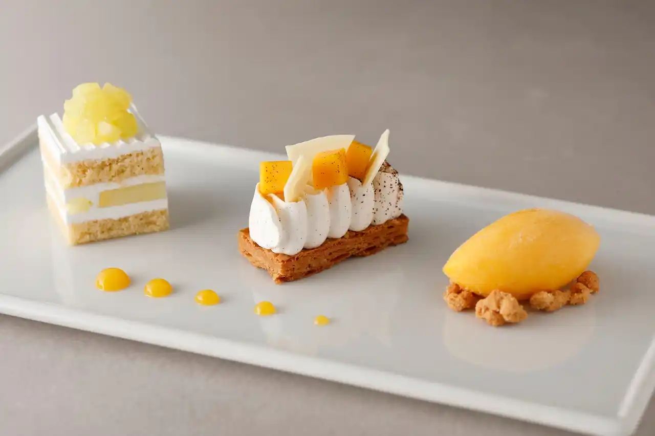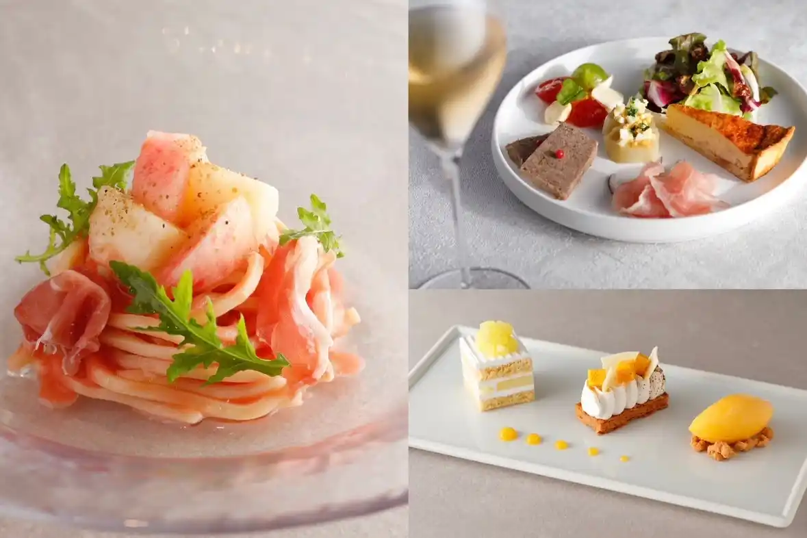 お食事の締めくくりに欠かせないデザートは、ホテルのペストリーブティック「パティスリーSATSUKI」と、館内に世界第一号店を構える「ピエール・エルメ・パリ」を一度に味わえる欲張りプレートをご用意。ホテルニューオータニのシグネチャースイーツである「スーパーシリーズ」の『スーパーメロンショートケーキ』や、今が旬のピーチやマンゴーを使用した、みずみずしく夏らしい一皿をご堪能ください。 |