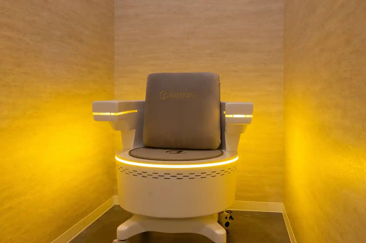 服を着たまま座るだけで「筋肉+脂肪」両方にアプローチできます。なかなか鍛えることのできない骨盤底筋や下半身を電磁パルスの刺激で座るだけで鍛えることができる美容マシンです。 |