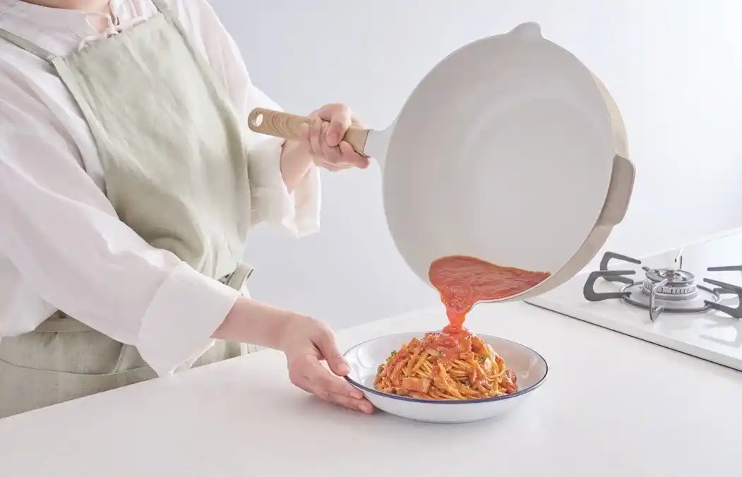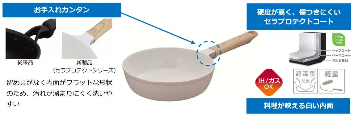 このたび新発売する『セラプロテクトシリーズ フライパン(KFOシリーズ)』は、高い硬度と傷つきにくさが特長のセラミックコーティング「セラプロテクトコート」を採用したフライパンです。本製品の内面は食材の色が確認しやすい白色で、味付けや焼き加減を確かめながら調理いただけます。外面色にはナチュラルベージュを、ハンドルにはやさしい色味の木目調を採用しており、ナチュラルテイストのキッチンにも調和する明るいデザインにしました。 |