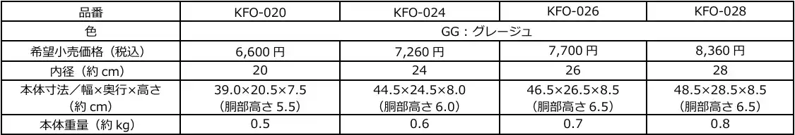 『セラプロテクトシリーズ フライパンKFO(KFO-020/024/026/028)』 仕様一覧 |