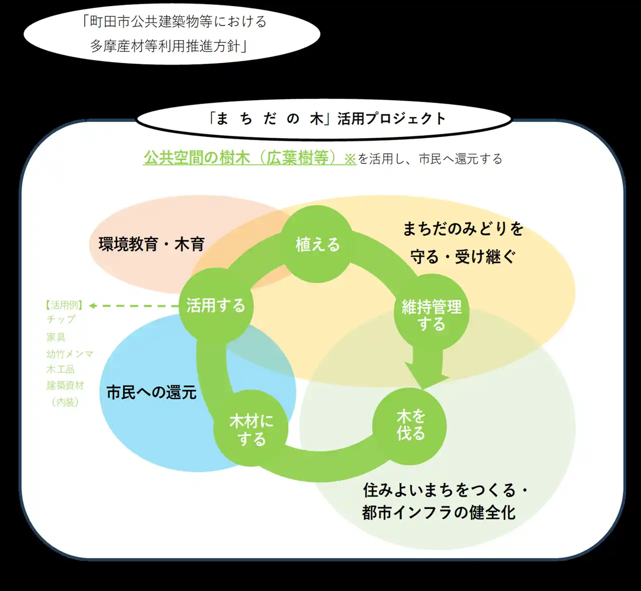 町田市では、2024年4月に脱炭素社会の実現に資することを目的とした「町田市公共建築物等における多摩産材等利用推進方針」を策定し、多摩産材をはじめとする国産木材の積極的な活用を図るとしています。 |