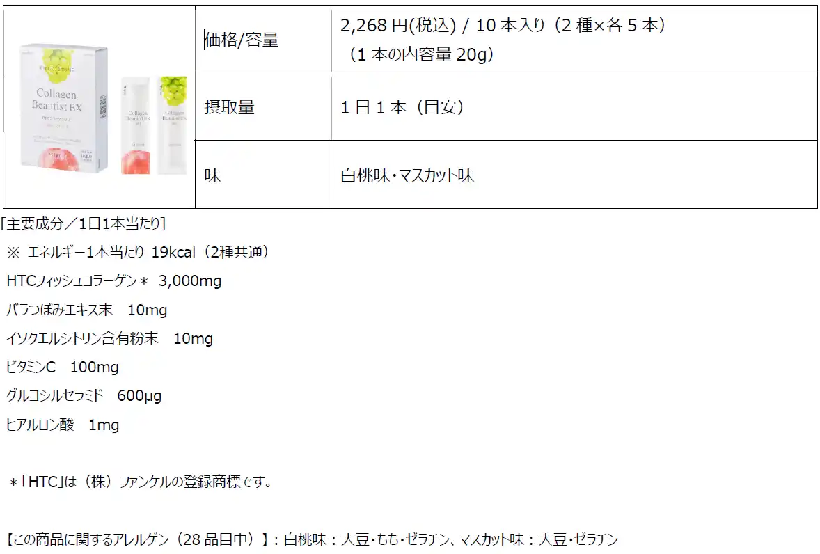 本製品は、おやつ感覚で手軽に本格的なコラーゲン補給ができ、1本で「HTCフィッシュコラーゲン*」を3,000mg摂ることができます。白桃、マスカットの2つの味を楽しめるアソートパックで、そのままでも、冷やしても、凍らせても美味しい、ハリ美活ゼリーです。 |