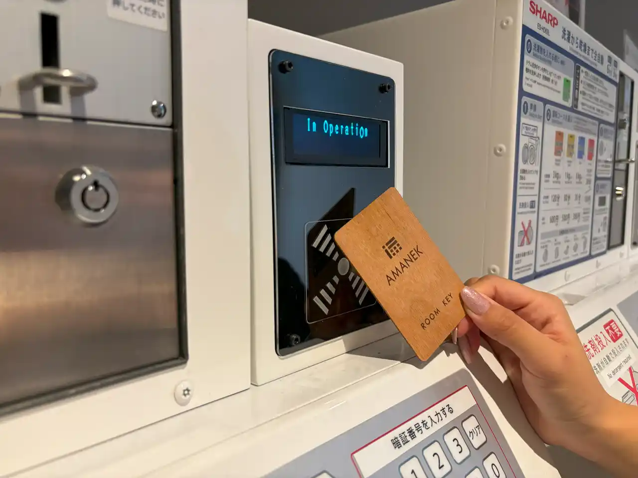 ご利用の際は部屋のカードキーを持参し、加盟店舗や館内の自動販売機・コインランドリーを含む一部設備に設置された専用端末にかざすだけで、商品やサービスの支払いが可能です。 |