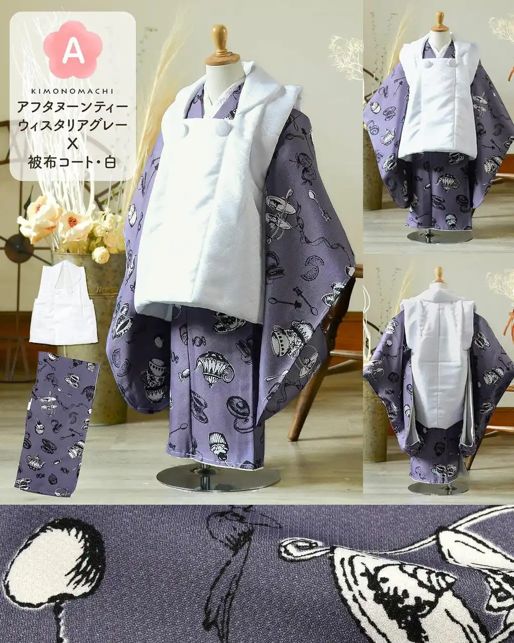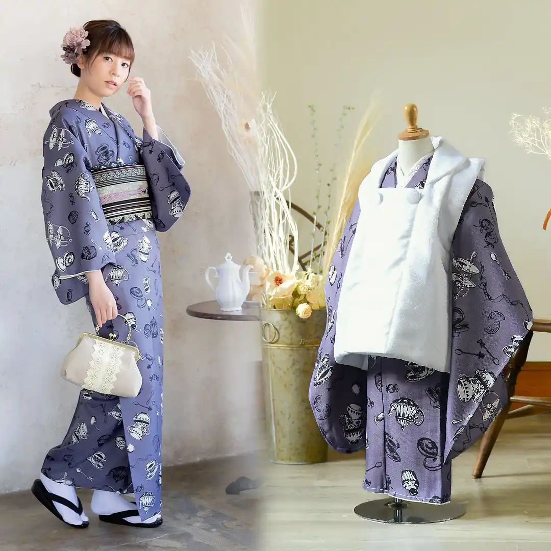 細かな地模様のある生地。グレイッシュな鈍い青紫色の地に、黒の線で表現された茶器やお菓子、フルーツなどアフタヌーンティーの品々を散らした模様。部分的に白く抜いた柄が際立って見えます。ペン画調のカップやケーキ、マカロン、レモンなど見ているだけでお茶会の楽しさをイメージさせるデザインです。被布コートは白です。 |