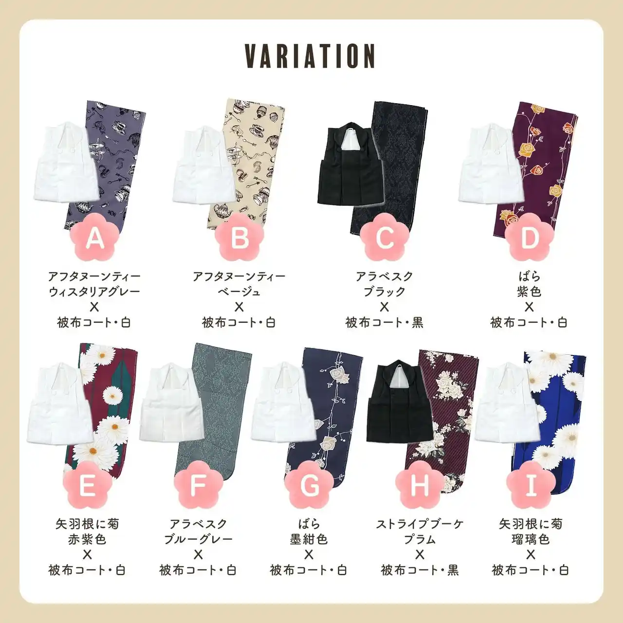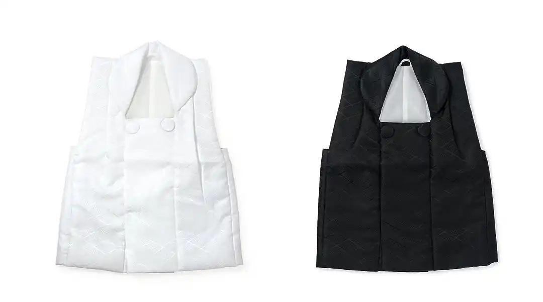 三歳コートにコーディネートする被布コートもKIMONOMACHIオリジナルで制作しています。白と黒と2色展開です。白と黒のどちらかを着物にコーディネートしています。シンプルでモダンなデザインに、光の加減で浮かび上がる入れ子菱に花菱の地模様がが上品な一着です。ふんわり綿入りの衿とやわらかな曲線が、愛らしさを引き立てます。セットの被布コートは着物とコーディネート済みです。 |