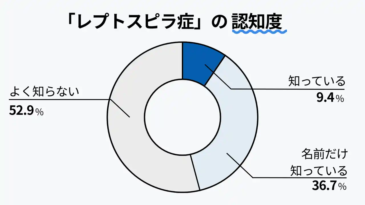 特に注意すべきは、野生動物の尿などで汚染された水や土から感染する細菌性の病気「レプトスピラ症」です。感染すると発熱や嘔吐などを引き起こし、重症化すると腎不全や肝不全で死に至るケースもある恐ろしい感染症ですが、その内容まで知っている飼い主は、わずか9.4%。36.7%が「名前だけ知っている」と回答しており、具体的な危険性についてはほとんど浸透していないことがうかがえます。 |