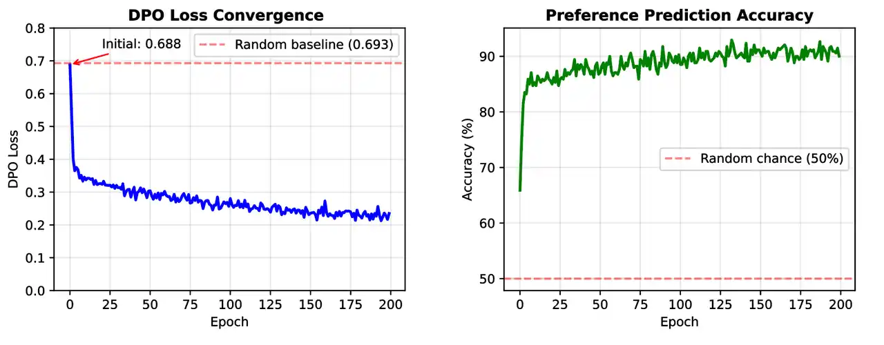 DPOは、従来のRLHF(Reinforcement Learning from Human Feedback)で必要だった複雑な強化学習プロセスの回避が可能です。RLHFでは報酬モデルの学習とPPO(Proximal Policy Optimization)などのRL手法を使う必要がありましたが、DPOは人間の好みデータから直接ポリシーを最適化します。 |