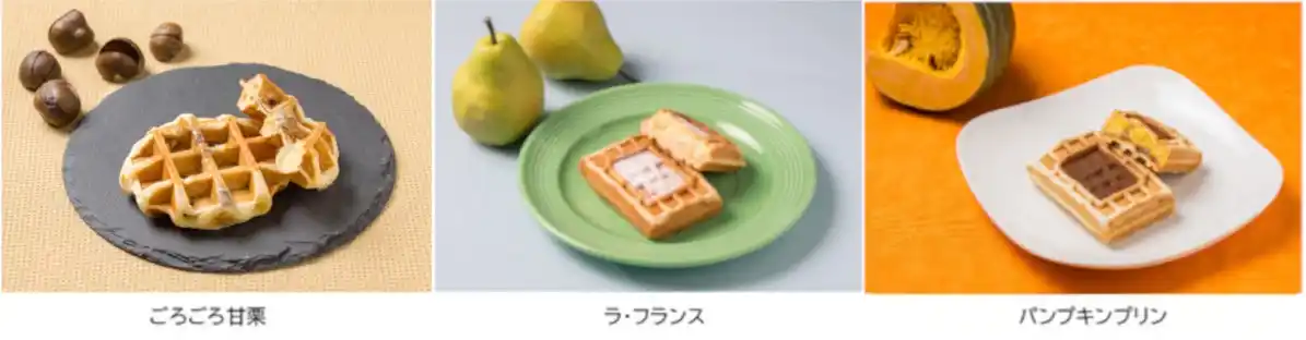 北海道産発酵バターを使った生地に天津甘栗の餡とダイスを包み焼き上げました。香り高い餡と相まって、栗の風味と食感を存分に楽しめるリエージュワッフル『ごろごろ甘栗』、山梨県産ラ・フランスを使用した香り豊かなクリームに、ダイス状の果肉を合わせて包み焼き上げた、甘みと酸味のバランスが絶妙な秋の爽やかなハッシュルワッフル『ラ・フランス』、北海道産えびすかぼちゃを贅沢に使用した濃厚クリームに、ほろ苦いカラメルを合わせ包み焼き上げ、ココアパウダーをかけて大人の味わいに仕上げたハッシュルワッフル『パンプキンプリン』の3種類です。 |