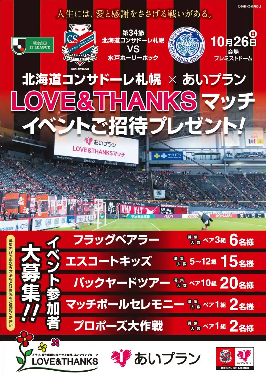 「北海道コンサドーレ札幌」のオフィシャルトップパートナーである株式会社あいプラン(本社:札幌市中央区、代表取締役社長:新道いくみ)は、2025年10月26日(日)、プレミストドームにて開催されるJ2リーグ公式戦において、冠試合『LOVE&THANKSマッチ 2025』を実施いたします。