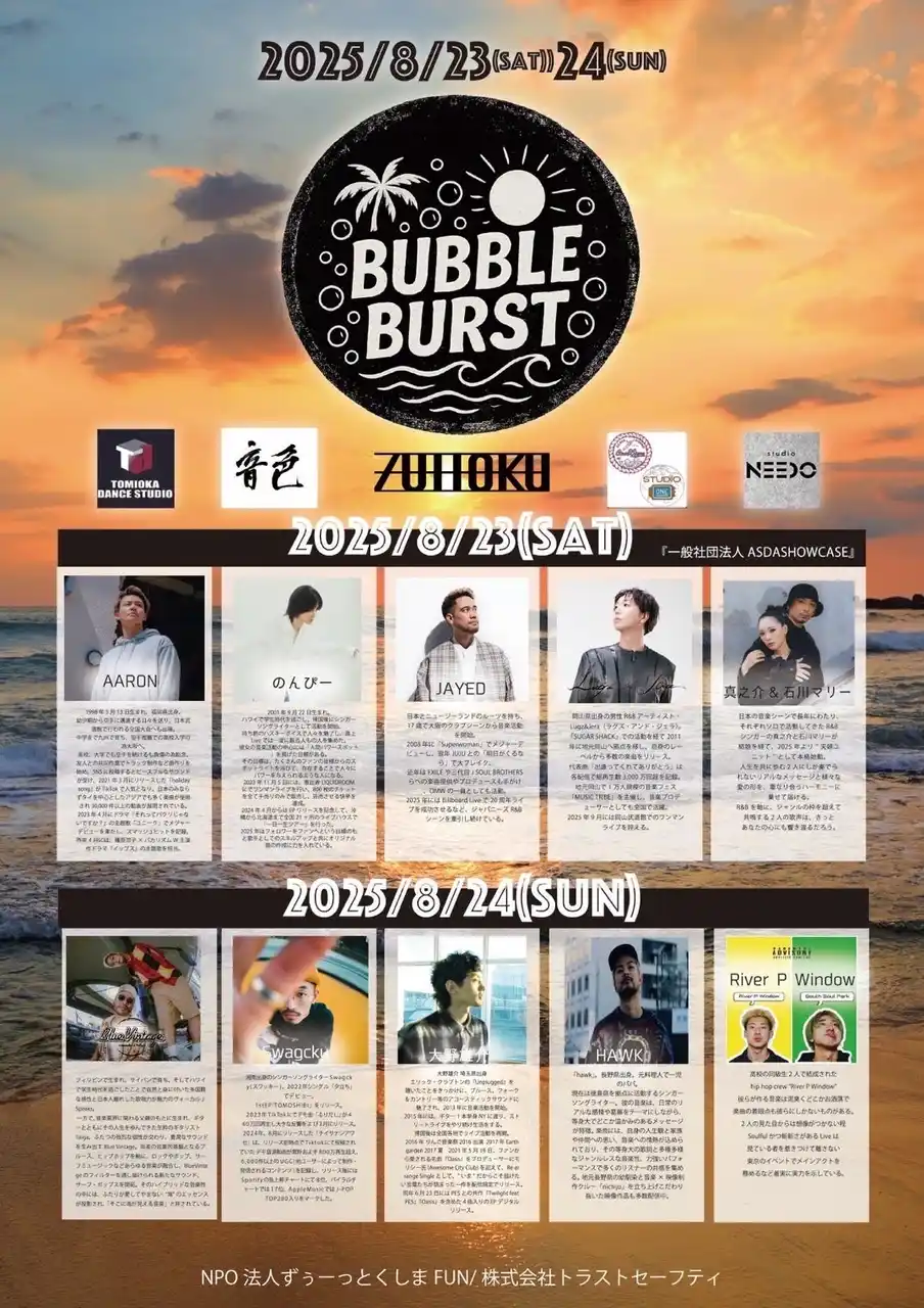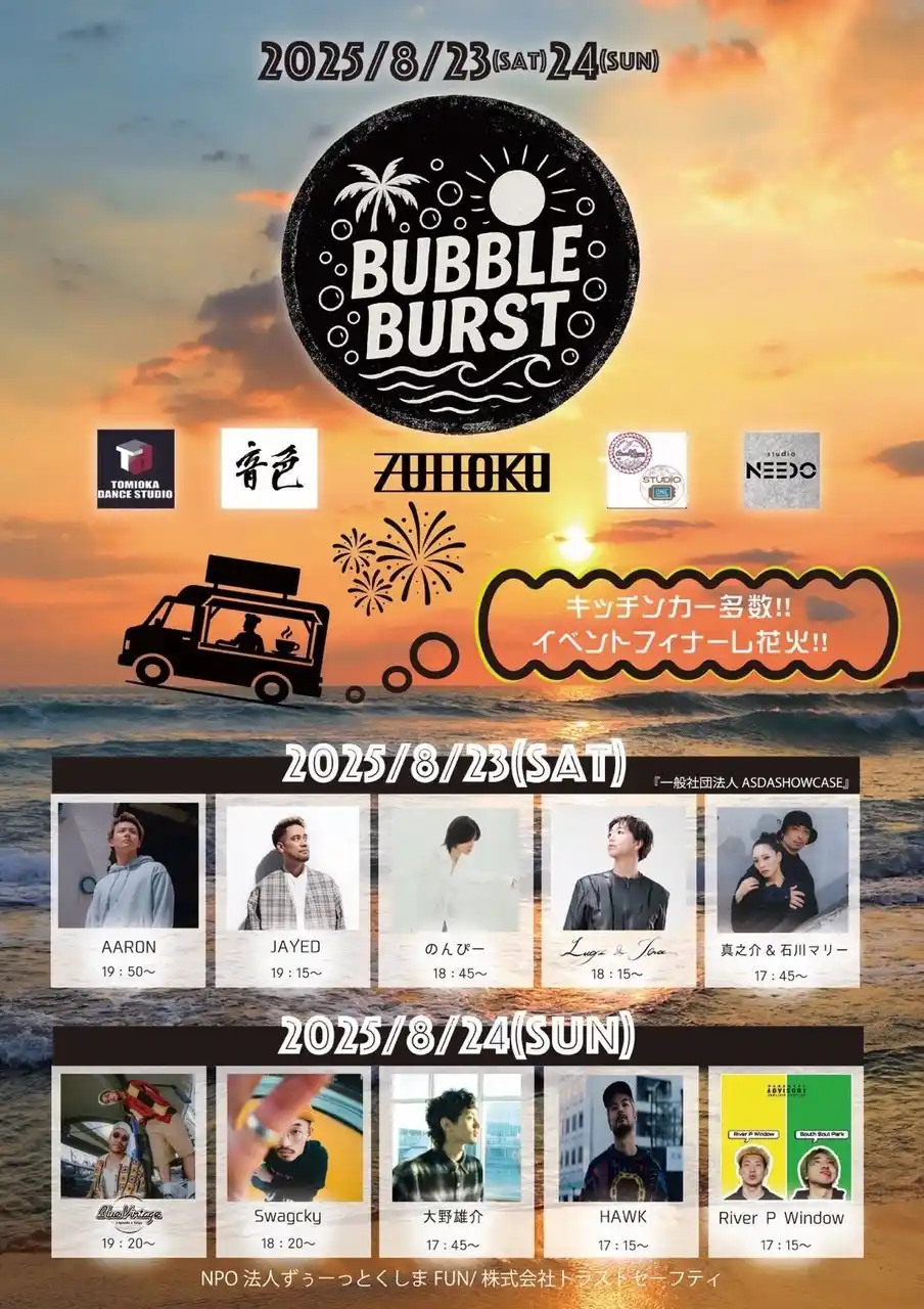 「BUBBLEBURST 2025」は、NPO法人ずぅ~っとくしまFUN(徳島県徳島市)が主催する、音楽とダンスをテーマにした無料の野外フェスティバルです。徳島市川内町にある小松海岸の特設ステージを舞台に、2025年8月23日(土)と24日(日)の2日間にわたり開催されます。 |