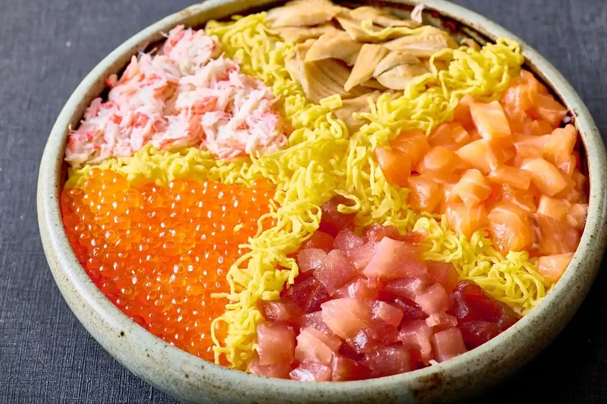 寿司(平日ランチ:サーモン親子ちらし/土日祝日ランチ限定:海鮮ちらし/ディナータイム:にぎり寿司 鮪、イカ、海老、こはだ)、白米 |