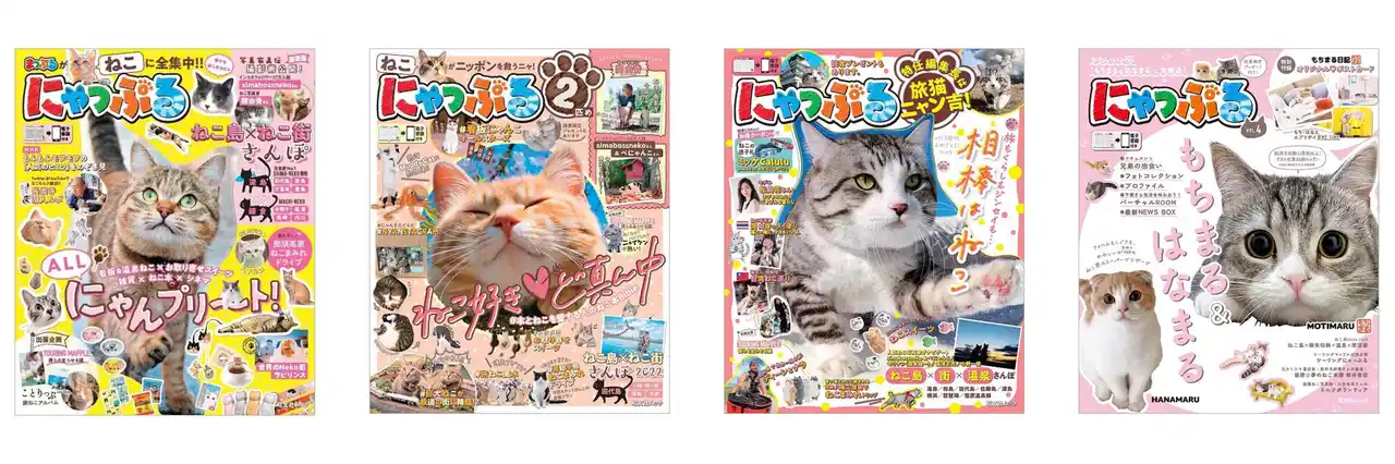 <左から『にゃっぷる』、『にゃっぷる2匹め』、『にゃっぷる 特任編集長は旅猫ニャン吉!』、『にゃっぷるVol.4』の各表紙> |