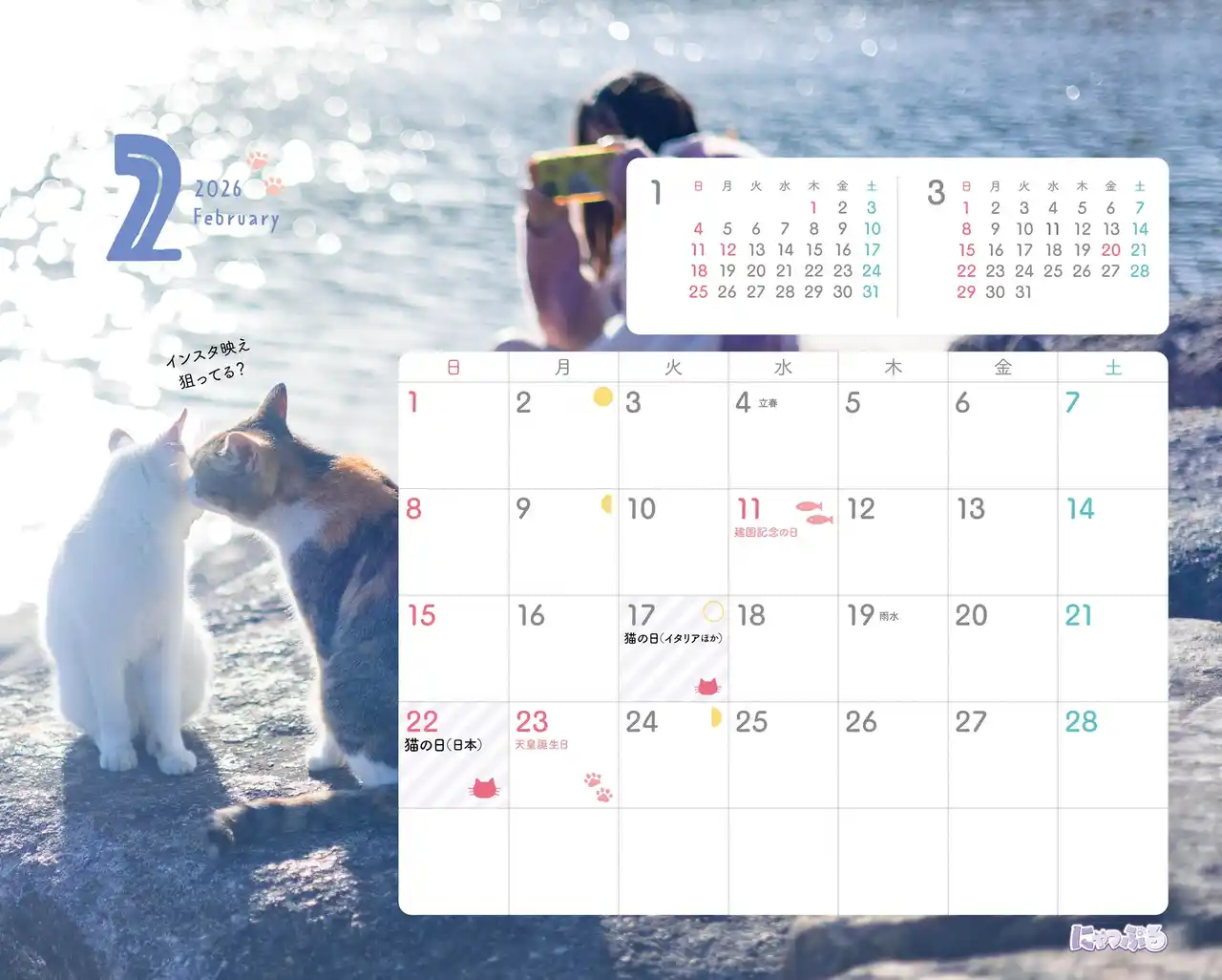 恒例の記念日情報やこよみ情報は今回も健在です。にゃんにゃんにゃんの2月22日、日本における「猫の日」に加え、世界各国の「猫に関する記念日」のほか、「月の満ち欠け」や季節の訪れを感じる「二十四節気」を掲載。ねこたちとともに日々の暮らしに癒し、彩りを添えます。 |