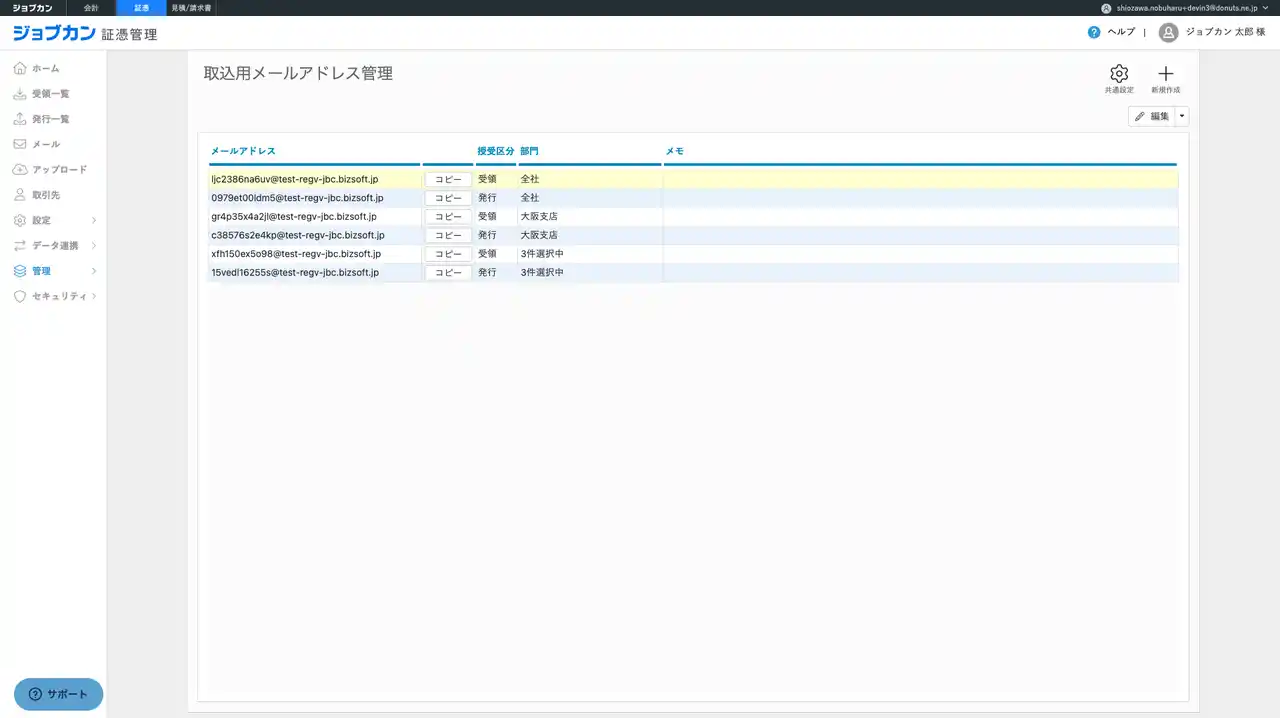 メールアドレスを部門設定と連動することが可能になり、指定のメールアドレスに送付された、受領帳票・発行帳票へ部門が自動で設定されます。 |