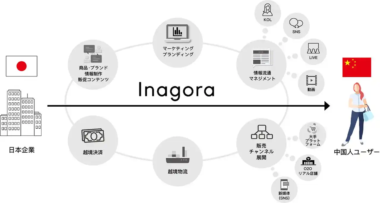 インアゴーラは、日本企業が海外進出を検討する際に必ず課題となる「情報の越境」「物流の越境」「決済の越境」のすべてを解決する、ワンストップソリューション型のB to B to C越境ECプラットフォーム「豌豆(ワンドウ)プラットフォーム」を運営しています。商品の翻訳、物流、決済、マーケティング、顧客対応、他チャンネル展開などの全工程を担うことで、日本企業と中国消費者間の文化的ギャップを吸収し、日本企業の中国進出をサポートします。日本の企業はインアゴーラの日本国内倉庫に商品を配送するだけで、国内ECショップを1店舗追加するよりも簡単に、巨大な中国市場に進出することができます。 |