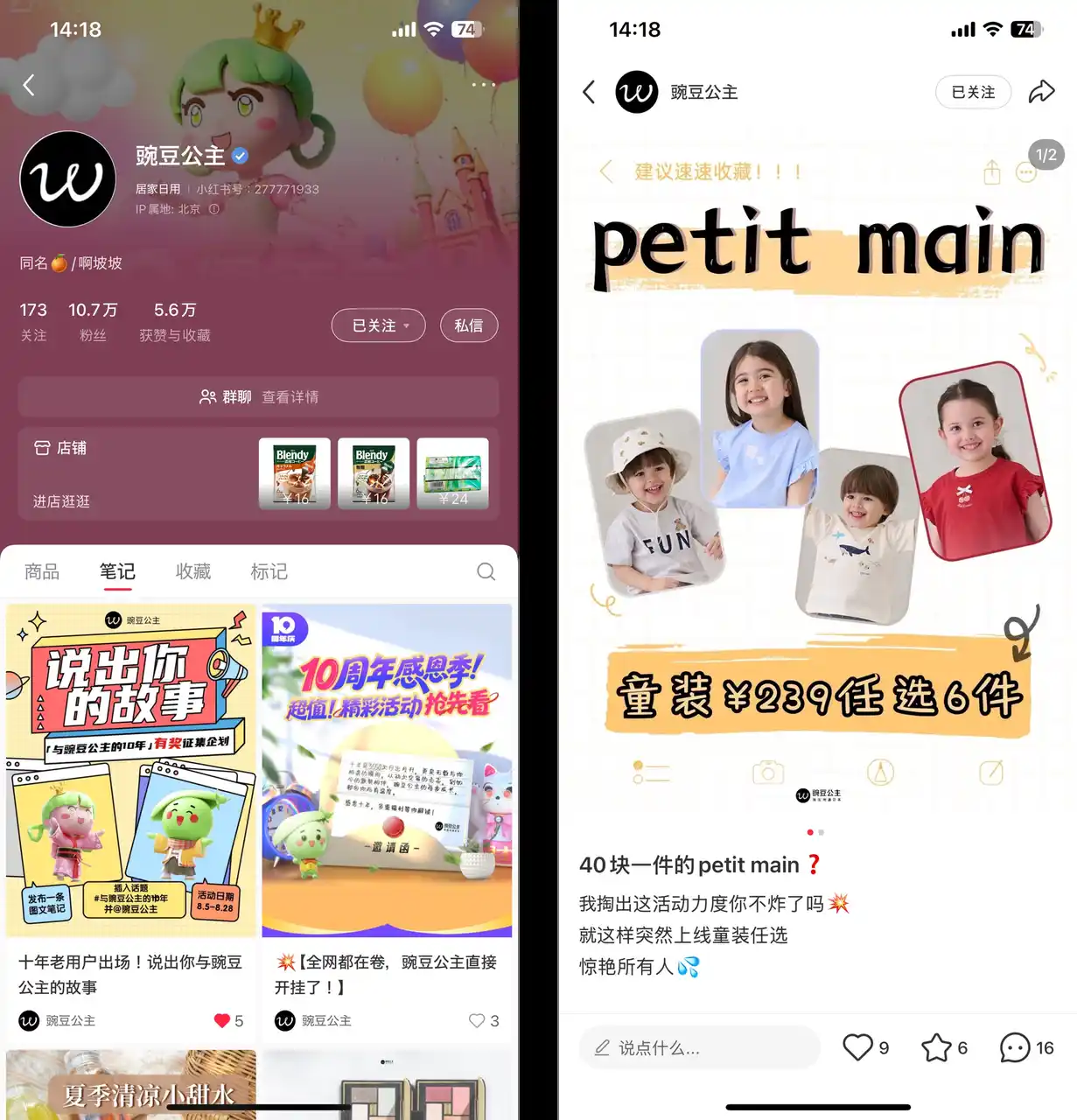 中国を代表するライフスタイル共有型SNSアプリの小紅書(Rednote)の自社アカウント「豌豆(ワンドウ)」は、ファロワーが約11万人おり、投稿いいね数が5.6万を獲得しているアカウントです。 |